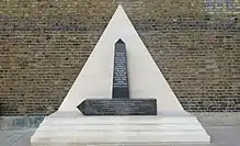 The African and Caribbean War Memorial was designed by Jak Beula of the Nubian Jak Community Trust. It consists of two 6-foot obelisks made from Scottish whinstone,[1] weighing approximately 0.75 tons. It is inscribed with the name of every regiment from Africa and the Caribbean who served in World Wars I and II, as well as where they served, and when.[12] It also includes a pyramidal plinth made from Ancaster stone and weighing just under 1.5 tons (combined weight 3 tons). The memorial is supported by Lambeth Council, the Department of Communities and Local Government, the Foreign and Commonwealth Office, the Heritage Lottery Fund, the Black Cultural Archives, Madstone Limited, the Association of West Indian Personnel and a number of community stakeholders.[12]