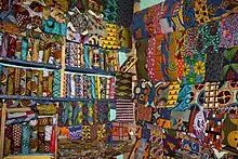 African wax prints, Dutch wax prints[1][2] or Ankara,[3] are omnipresent and common materials for clothing in West Africa and Central Africa. They were introduced to West and Central Africans by Dutch merchants during the 19th century, who took inspiration from native Indonesian designs.[4] They began to adapt their designs and colours to suit the tastes of the African market. They are industrially produced colourful cotton cloths with batik-inspired printing.[5] One feature of these materials is the lack of difference in the colour intensity of the front and back sides. The wax fabric can be sorted into categories of quality due to the processes of manufacturing. The term "Ankara" originates from the Hausa name for Accra, the capital of what is now Ghana. Initially used by Nigerian Hausa tradesmen, it was meant to refer to "Accra," which served as a hub for African prints in the 19th century.[6]