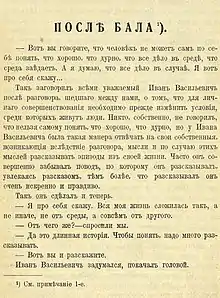 Tolstoy uses a framing narrative in "After the Ball," as within Tolstoy's story Ivan recalls the story to his friends later in life.[12] Because of this, the reader only hears of the series of events from the point of view of Ivan Vasilievich, and his own thought processes serve as a framework to manifest the blurred line between right and wrong.[3] The story is also framed as a bildungsroman, as Ivan Vasilievich describes how he went from a "very pert and merry lad, and rich besides,"[12] to one whose "whole life was changed" after being witness to the capability of human brutality.[12]