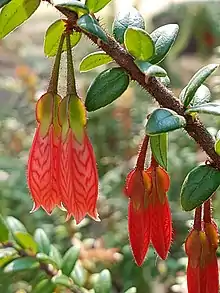 Agapetes serpens is a semi-climbing shrub species native to the Himalayas. 40–60 cm tall, it is grown as an ornamental for its attractive pendulous branches of red tubular flowers blooming over a long period. It is mostly grown in climates from cool temperate to sub-tropical. Propagation is from cuttings.