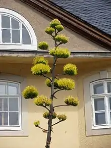 Like most agaves, the species is monocarpic, that is to say it only flowers once and then dies. This flowering occurs after 15 to 25 years producing a vertical floral stem, typically up to 4 m (13 ft) long and bearing greenish-yellow flowers. The largest specimens have been significantly taller. One specimen growing at the Strawberry Canyon Botanical Garden on the campus of U. C. Berkeley, Berkeley, California in 1974 produced an inflorescence with a total height of 52 feet (16 m) of which the scape or peduncle was about 39 ft 4 in (11.99 m) and the panicle per se was 13 feet (4.0 m).[8] Hermann J.H. Jacobsen states that the inflorescence of A. salmiana has reached an overall height of 62 feet (19 m),[9] making the inflorescence of A. salmiana the tallest of any known species of plant.