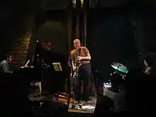 By 1973, Davis had established most of his band's line-up, a septet featuring bassist Michael Henderson, guitarists Pete Cosey and Reggie Lucas, drummer Al Foster, percussionist James Mtume, and saxophonist Dave Liebman; Liebman left the group the following year and was replaced by Sonny Fortune.[5] Lucas, Foster, and Mtume functioned as the band's rhythm section, while Cosey, Henderson, and Fortune were given space to improvise as soloists.[6] Their concerts – played frequently at rock venues and festivals – became opportunities for Davis and his sidemen to test new musical ideas and ways to exploit electronic equipment.[7]