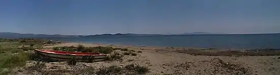 Its seaside is the continuation of Kalyves Polygyrou's with a very long sandy beach, after the river Olynthios delta, including Papa Aloni beach and Portes before Nea Potidea.