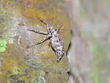 Adults emerge from overwintering pupae in February and March. The females climb up tree trunks and the males fly weakly to them.