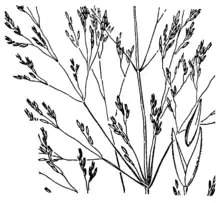 It is a perennial bunchgrass growing in 75 centimeters tall. The leaves are flat and up to 30 centimeters long. The inflorescence is a wide open array of wispy branches bearing clusters of spikelets each a few millimeters long.