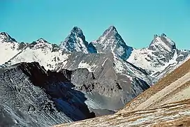 The Aiguilles d'Arves, seen from the Cerces plateau. From left to right: Aiguille Méridionale, Aiguille Centrale and Aiguille Septentrionale.