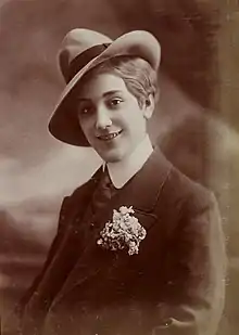 Born in Brighton in 1882 as Emily Strahan Cager,[3] the illegitimate daughter of domestic servant Emily Cager[4] and raised in London, she arrived as a dancer in one of the first of Tiller Girls troupes to visit Paris at the time of the Exposition Universelle of 1900 and would never leave again. Her lively on-stage character and English accent while speaking French greatly amused audiences at the Folies Bergère.[1] She adopted the stage name Aimée Campton and met the actor Charles Prince (real name Charles Ernest René Petitdemange) whom she married in Paris on 20 December 1900.[5][6] Less than two months later in February 1901 their only daughter Renée Petitdemange (1901-1993) was born. The couple divorced in April 1905.[7]