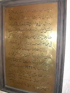 The translation of the metallic plate is: "The honourable late Pasha Abdel-Rahim Moustafa El-Demerdash (may he have all God's forgiveness) and the two ladies his wife Zainab Hanem El-Demerdashiah and his daughter Qout Alqoulob Hanem El-Demerdashiah have donated—on the 5th of August 1928—by the piece of land on which this Hospital was erected which is 15,000 meter square, and donated the sum of 100,000 Egyptian Royal Pounds to be divided as 40,000 for the building of the hospital and 60,000 to be put into a Waqf and its benefits are dedicated to the expenses of running the hospital."