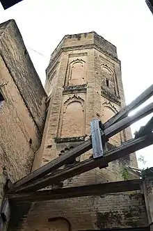 The mosque is unusual in two respects. One is its octagonal minaret, which is rare in Fes and in much of Morocco where minarets with a square base are standard.[2][5] Its other unusual characteristic is that it has two prayer halls on two different stories. The prayer halls are nonetheless in the usual hypostyle format with rows of columns supporting horseshoe arches. The mosque also has a courtyard with a fountain, like other sahns of Moroccan mosques.[2]