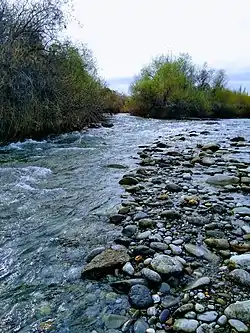 The Ak-Buura (Kyrgyz: Ак-Буура) is a river in Kyrgyzstan and Uzbekistan. It flows through the city Osh, and discharges into the Shahrixonsoy, one of the canals of the Fergana Valley. The river is formed at the north slopes of Alai Mountains. The river is 148 kilometres (92 mi) long, and the watershed covers 2,530 square kilometres (980 sq mi).[1] The long-term average discharge of the river at Tölöykön gauging post (southern boundary of Osh) is 21.4 cubic metres per second (760 cu ft/s), high-water discharge (June–July) ranging from 50 cubic metres per second (1,800 cu ft/s) to 67 cubic metres per second (2,400 cu ft/s) and low-water discharge (January) from 5 cubic metres per second (180 cu ft/s) to 6 cubic metres per second (210 cu ft/s).[2] The main settlements along the river Ak-Buura are the city Osh and the villages Tölöykön, Turuk and Papan.[3]