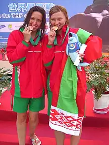 ![]() Aksana Petrushenka (right) along with fellow Belarusian swimmer Natalia Deeva (left) posing with gold medals during the 2007 World Deaf Swimming Championships Award Ceremony of Women's 200 Breaststroke event | |||||||||||||||||||||||||||||||||||||||||||||||||||||||||||||||||||||||||||||||||||||||||||||||||||||||||||