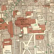 The Al-Khanqah al-Salahiyya Mosque (Arabic: مسجد الخانقاه الصلاحية al-Khānqāh aṣ-Ṣalāḥiyya) is an Islamic place of worship located in the Christian Quarter of the Old City of Jerusalem, north of the Church of the Holy Sepulchre.[1][2][3] It was named after Saladin, who endowed it. As the name indicates, the complex was originally a khanqah, a place for gatherings of Sufi Islamic adherents, including dervishes. The complex today comprises the mosque as well as a school, a public sitting room, rooms for military officers, a dining room for wayfarers, small rooms for guards, and a very small room for Saladin’s spiritual retreat.[4]
