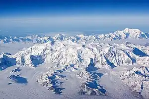 This ecoregion consists of a long range of high rocky mountains of the Alaska Interior running north from the bottom of the Alaska Peninsula, eastwards taking in the Alaska Range and southwards to include the Wrangell and St. Elias Mountains in eastern Alaska on the Canada–US border as far as Yakutat Bay. Across in Canada, the ecoregion includes the southwestern corner of the Yukon Territory and the northwestern corner of British Columbia. These mountains are largely covered with permanent ice and snow, with permanent snow above about 2150 m, and are separated by valleys filled with ice fields and great glaciers. There are small patches that are not under ice and consist of rock, rubble and alpine tundra. Elevations of the ecoregion range from sea level (on the western coast) to 600 m in the valleys, to peaks over 4,000 m. Indeed, Denali (Mount McKinley), the highest peak in North America at 6,100 m, is located here, while the St Elias Mountains reach as high as 6000 m and are some of the highest peaks in Canada. This ecoregion is largely separated from the coast by the Pacific coastal mountain icefields and tundra so the climate is continental. Rainfall varies from 200 mm per year on the higher slopes to 400 mm per year in the lower areas.[1]