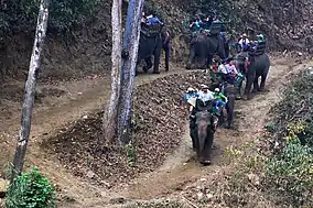 Asian elephant (Elephas maximus), gaur (Bos gaurus), Himalayan black bear (Ursus thibetanus), sun bear (Helarctos malayanus), dhole (Cuon alpinus), sambar deer (Cervus unicolor), Indian muntjac (Muntiacus muntjak), wild boar (Sus scrofa), Indian crested porcupine (Hystrix indica) and black giant squirrel (Ratufa bicolor) were sighted during a transect survey in January 1999.[5] The elephant population was estimated at between two and 41 individuals in 2003, based on dung surveys conducted over three years.[6] Wildlife recorded during a camera trap survey in 1999 comprised yellow-throated marten (Martes flavigula), Asian palm civet (Paradoxurus hermaphroditus), large Indian civet (Viverra zibetha), small Indian civet (Viverricula indica), hog badger (Arctonyx collaris), crab-eating mongoose (Herpestes urva), leopard (Panthera pardus), Asiatic golden cat (Catopuma temminckii) and leopard cat (Prionailurus bengalensis).[7][8]