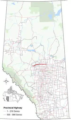 - ↑ Department of Public Works (1939). Official Road Map (PDF) (Map). Province of Alberta. §§ D-5, E-5.