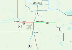 Highway 19 runs for 12.27 km (7.62 mi). It begins at an intersection with Highway 60 as an eastern extension of Halicz-Gildehurst Road at the south end of Devon, proceeding east across Leduc County, intersecting several local roads and crossing Whitemud Creek, where it passes through the extreme southern extent of Edmonton and goes by the name of 105 Avenue SW.[1] It passes north of Edmonton International Airport and becomes a divided highway before a partial cloverleaf interchange with Highway 2 shortly thereafter, marking the end of Highway 19.[3] East of the interchange the divided highway, now designated as Highway 625, continues as the main east–west thoroughfare through industrial and business areas of Nisku. At the east end of Nisku, the divided highway ends and the two-lane road continues east to an intersection with Highway 814 in Beaumont, providing an alternate route north into Edmonton. Further east, Highway 625 ends at Highway 21 (20.24 km (12.58 mi) from Highway 2) south of the hamlet of Looma, and continues in Leduc County as Township Road 504 to Ministik Lake.[2]