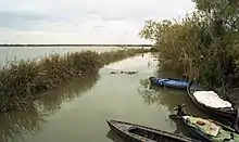Although the Albufera has its own hydrological basin, the reality is that this only provides a small part of the contributions, while the vast majority of the water arrives from the Júcar and Turia rivers (to a lesser extent). In this sense, the Albufera is an integral part of the hydrological scheme of the Júcar river, as it also receives, through a network of sixty-three acequia, the water left over from irrigation. These acequia also collect part of the wastewater discharges from surrounding towns, such as El Romaní.[11] The acequia of the Vega de Valencia take the waters of the Turia river after the Acequia Real de Moncada, taking advantage of the last flows, and leaving their surplus and runoff for the acequia del Oro and the irrigated lands of Francos and Marjales de la Albufera de Valencia.