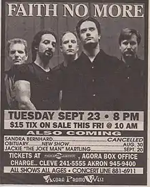 The Album of the Year tour is notable for featuring Limp Bizkit, a nu metal/rap metal band greatly influenced by Faith No More, as an opener for several 1997 US dates. They were frequently booed by Faith No More's fans, including during a September 1997 concert at the Electric Factory in Philadelphia, where the crowd booed them off stage.[5] In a 2013 interview, Roddy Bottum reflected on the shows with Limp Bizkit, recalling "I fought it at the time. I had to really push to get a couple bands that I liked to get on the bill in Portland and Seattle on that leg. I had no interest in the sound of Limp Bizkit. It was not how I wanted to be represented at all. Not to be snotty at all, but that guy Fred Durst had a really bad attitude. He was kind of a jerk."[6] Bottum also remembered an incident where Durst "called the audience faggots at one show when they booed him."[6] Durst apologized to him after this show, as he did not know that Bottum had come out as gay in the early 90s.[7] Limp Bizkit's guitarist Wes Borland later claimed that his band were excited about the prospect of getting to tour with Faith No More, stating "the idea of it was cool [but] once we got there, it was a really tough crowd. They have a really tough crowd to please, who are very vocal about not liking you. We opened for Faith No More and Primus in the same year, and the Primus tour went a lot better than the Faith No More tour."[8] Borland added that he did not get to know Mike Patton personally until several years later.[8]