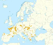 Although Myotis alcathoe was initially known only from Greece and Hungary and was thought to be restricted to southeast Europe, records since then have greatly expanded its range, and it is now known from Portugal, Spain and England to Sweden and European Turkey.[40] In several European countries, focused searches were conducted to detect its occurrence.[41] Its habitat generally consists of moist, deciduous, mature forest near streams, for example in ravines or in alluvial forest (forest near a river),[42] where there are many decaying trees that the bat can use as roosting sites.[43] In Germany, its preferred habitat consists of mixed deciduous forest.[44] In the south of the continent, it usually occurs in mountain ranges, but the factors affecting its distribution in the north are less well known. Its range appears to be similar in shape to those of the greater and lesser horseshoe bats (Rhinolophus ferrumequinum and R. hipposideros) and Geoffroy's bat (Myotis emarginatus).[42] It may yet be found in other European countries, such as Ireland and Moldova.[45] Although there are abundant records from some areas, such as France and Hungary, the species appears to be rare in most of its range.[46]