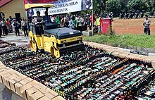 In February 2010, 16 people died and 5 lapen sellers were arrested in Yogyakarta, due to alcohol poisoning and illicit alcohol production.[34] In September 2010, three Russian Sukhoi fighter technicians died in Makassar from methanol poisoning in their drinks.[35] Yogyakarta residents were again affected by badly made alcohol in 2016.[36] Other traditionally made alcoholic spirits such as Solo's ciu, Manado's cap tikus, and some Balinese arrack are known as illegal alcohol, also due to the high incidence of alcohol poisoning.