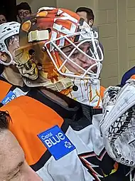 On July 13, 2022, Lyon signed a two-way free agent contract with the Florida Panthers.[23] Lyon posting a 7–2 record with a 2.00 GAA over his last nine starts for the Charlotte Checkers. With Panthers starting goaltender Sergei Bobrovsky ill and regular backup goaltender Spencer Knight participating in the NHL's player assistance program for undisclosed issues, Lyon was called up to the NHL.[24][25] He proceeded to lead the team on a lengthy winning streak that brought the team back into contention for the 2023 Stanley Cup playoffs, earning the nickname "the Lyon King."[26] Such was his success that he retained the starting role even after Bobrovsky returned, with the latter praising him, saying he "basically saved our season."[27] Lyon started the opening games of the Panthers' first round playoff series against the Boston Bruins. However, with the Bruins leading the Panthers two games to one following Game 3, coach Paul Maurice opted to return Bobrovsky to the net, stating that he felt Lyon was fatigued.[28] Bobrovsky proceeded to lead the team to victory against the Bruins, and onward through the second and third rounds of the playoffs to the 2023 Stanley Cup Finals against the Vegas Golden Knights. Lyon served as backup goaltender.[29] He took the ice against in Game 2 of the Finals, relieving Bobrovsky after he allowed four goals.[30]