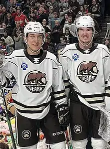 Martin Fehérváry (left) and Alexeyev (right) following the Hershey Bears' Teddy Bear Toss Game in 2019