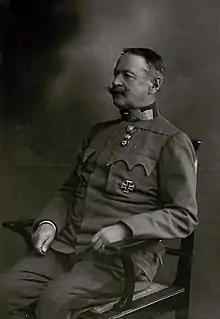A close associate of the army chief of staff Conrad von Hötzendorf, Krobatin was appointed Imperial and Royal Minister for War on 12 December 1912 and as an integral member of the "war party" gave his full backing to the hawkish element in the military in their calls for an immediate attack on Serbia following the Assassination of Archduke Franz Ferdinand on 28 June 1914 and the July Ultimatum.[3] With the outbreak of the First World War, Krobatin was responsible for the task of harnessing the economies of industrial Austria and agrarian Hungary to ensure the now mobilised military was supplied with vital arms and munitions as well as increasing industrial efficiency to meet the needs of a state with a large cohort of its industrial population no longer available for industrial and food production given their enlistment for war.[4] According to a number of sources, Krobatin struggled in his task for the first two years of the war, and although he never really harnessed the economy efficiently, he succeeded in tripling the level of artillery available at divisional level.[3]