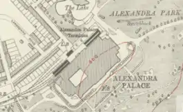 The station was built by the Muswell Hill Railway (MHR) and opened on 24 May 1873 along with the Palace. However, when the Palace burned down only two weeks after opening, the train service was considerably reduced and from 1 August 1873 was stopped for almost two years whilst the Palace was rebuilt. The station reopened on 1 May 1875, but there were several further periods of temporary closure due to insufficient demand, including from August 1882 to March 1885 and September 1885 to May 1889.[2] When it reopened in March 1891 after another closure it was renamed Alexandra Park in reference to the wider area rather than just the Palace in order to stoke higher demand.[3] The increased demand did not materialise, and the original Alexandra Palace name was restored in 1898.