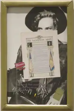 Smith combined text and imagery from a variety of sources to explore the psychology of the American identity.[11] She drew elements for her collages from pop culture, movies, romance novels, magazines, and advertising,[12] as well as the fiction and nonfiction works of a wide range of writers including Walt Whitman, Gertrude Stein, Thomas Mann, and Raymond Chandler.[13] Hollywood stories, the celebrity culture, advertisements, and Hollywood memorabilia figure frequently in her work, in part due to her upbringing in Los Angeles.[14] To Smith Hollywood is a place fraught with symbols and redolent with possibility, which engenders a different concept of art than that on the East Coast.[4][15]