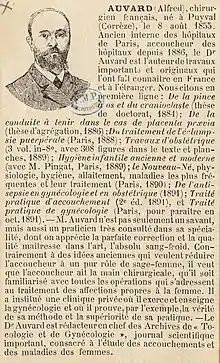 During the 1880s, he introduced the "Auvard couveuse", an inexpensive incubator that became widely popular in the latter part of the 19th century.[2][3] Other eponyms in the field of obstetrics that bear his name are: "Auvard maneuver" - a procedure for extraction of the placenta; "Auvard's vaginal speculum", and "Auvard's basiotribe" - an instrument that is a combination of a craniotomy forceps and a cranioclast.