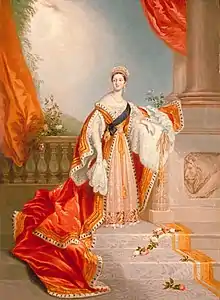 Known for his portraits of the good society of London, he was chosen by Queen Victoria to paint a gift to her mother:[3] Victoria in her State robes going to the House of Lords for her first official act, the prorogation of the Parliament, on 17 July 1837. After this task, Chalon was entitled Portrait Painter in Water Colour to Her Majesty and gained some celebrity. His 1837 portrait was engraved by Samuel Cousins and distributed to the public the day of Victoria's coronation, the 28 June 1838; and the next year Cousins produced a second, smaller, engraving.[3][4][5] Then, starting in 1851, the "Chalon head" appeared on some British colonies' postage stamps.