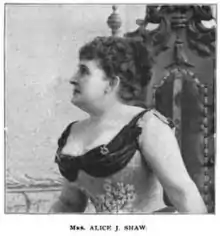 Later in life, she performed with two of her daughters, Ethel and Elsie, whistling and singing twins known as "the May Blossoms."[3] Shaw also made some of the earliest recordings of whistling. In 1888, while touring England, she made wax cylinders with Edison's representative, George Edward Gouraud. She later made commercial recordings, some of which have survived.[4] She was also one of the earliest celebrity spokeswomen for a weight loss product, in 1897 ads for "Dr. Edison Obesity Pills and Obesity Fruit Salts".[7]