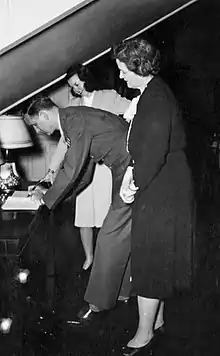 Throughout the majority of her husband's tenure as governor, the United States was involved in World War II.[1] As First Lady, Broughton assisted in the war effort, promoting victory gardens across the state and tending to one at the governor's mansion.[1] She apportioned the food served at the governor's mansion, including the traditional breakfasts served to members of the North Carolina General Assembly.[1] When the news spread that the First Family of North Carolina's meals were affected by wartime rationing, many North Carolinians sent food stamps to the family.[1] Broughton opened the mansion up to military servicemen for overnight weekend visits to boost morale.[1] She promoted a national rubber drive for the war effort by stripping fifty-eight pounds of rubber tread from the service staircase in the governor's mansion, taking it to a collection center in Raleigh on July 10, 1942.[1][4] Accompanied by a reporter and a photographer from the Raleigh Times, Broughton attempted to donate the rubber to the collection center.[4] The center attendants refused the donation, so she donated to another center across the street.[4]