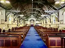 Internally, walls are rendered and all windows feature stained glass. The nave has hammer-beam trusses with a boarded ceiling. The chancel has scissor braces with a boarded ceiling. An organ gallery has been installed at the western end of the nave. This is supported by metal posts and is accessed via a spiral cast-iron stair.[1]