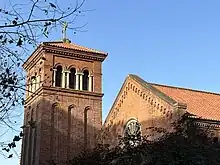 ![]() The Neo-Romanesque tower and sanctuary of All Saints, 2023. The rose window on top of the sanctuary is visible. | |