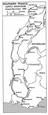 On 10 September, the Coastal Base Section was renamed the Continental Base Section.[68] Dijon was captured the following day, and on 18 September the advance party of the Continental Base Section headquarters moved there, followed by the main body on 1 October. It was initially established in the Grand Hôtel La Cloche, but later moved to the former Gestapo headquarters at 32 Rue Talant.[69] On 26 September, the Continental Base Section was redesignated the Continental Advance Section (CONAD), effective 1 October. The Marseille area was turned over to the new Delta Base Section, under Ratay's command.[70] The boundary between the two was the northern boundaries of the French departments of Ain, Rhône, Loire and Allier.[65] The Delta Base Section became responsible for 190,000 troops spread over 110,000 square miles (280,000 km2).[71]