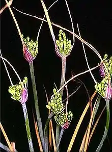 Allium nebrodense is unusual in the genus is that the scape is not erect but rather ascending (horizontal in the lower part, then curving upwards). Spathes are also unusual in their conspicuousness, narrowing to a pair of long red claws on either side of the umbel, much longer than the umbel itself. The flowers themselves are yellow.[6][7]