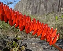 The flowers are orange-red, born on very short pedicels (1-2mm), on a simple, hardly branched inflorescence, which spreads out horizontally. [1]