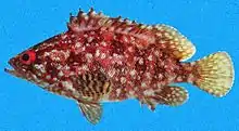 Alphestes immaculatus has a strongly compressed, deep body with large eyes and a short snout and a straight forehead.[3] The dorsal fin has 11 spines and 17-19 soft rays while the anal fin has 3 spines and 9 soft rays. It has a rounded preopercle with an obviously serrated rear edge and a large spine, which is usually covered with skin, projecting downward and forward at its angle. The head and body are marbled reddish brown in colour, with obscure bars and small dark and pale spots all over the head, body and dorsal, anal and caudal fins. The pectoral fins have 7 or 8 irregular horizontal series of small dark spots running across them. The maximum recorded total length is 30 centimetres (12 in) but they are more normally around 18 centimetres (7.1 in).[2]