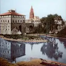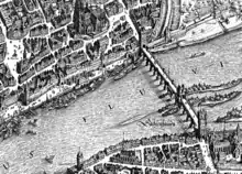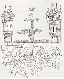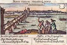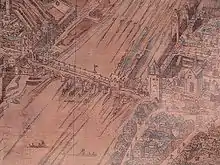 In the beginning of the 15th century, 10 of the 13 bridge arches as well as the two bridge towers were fundamentally renovated. The accountable architect might have been Madern Gerthener, who personally vouched for the safety of the vaults and arches in front of the (city?) council on 30 November 1399. On a hiking trip in Prague, Gerthener learned about the Charles Bridge, which had been built shortly before by Peter Parler. The oldest depiction of this bridge comes from 1405: It is shown in stylized form in the "Bedebuch" (burnt in World War II), with the two towers, three arches and the crucifix of the Brickegickel. The oldest complete drawing can be found in the Cosmographia of Sebastian Münster, as a part of the birds-eye view of Frankfurt, in the second issue from 1550. It is a woodcut which itself is dated 1545.[8] Shortly thereafter, in 1552, another depiction appeared on the so-called "Belagerungsplan" (besiegement plan) of Conrad Faber von Creuznach, who had already sketched the bridge in the background of his double portrait of Anna and Gilbrecht von Holzhausen in 1535.[9][10] It shows the bridge during the three-week besiegement of the Protestant city by an army of the Protestant prince, under lead of the Prince-elector Maurice, Elector of Saxony in the summer of 1552, when it was defended by the Imperial Army. During this time, the bridge had been covered by cloths, and the Main had been rendered impassable by sunken ships and an iron chain. The besiegement started on 17 July and ended with the conclusion of the Peace of Passau contract on 2 August. For the city, the loyalty to the imperator paid off well: Beginning with 1562, all coronations of the Holy Roman Emperor took place in Frankfurt.
