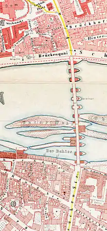Back then, the Sachsenhausen Main riverside was located considerably more in the south than it is today. The about 20 metres wide upper wharf at the riverside road, and the 23 metres wide lower wharf had not been created before 1880; until then, the Main river reached up to the front of the first houses. Upside of the bridge, the Sachsenhausen city wall touched the river. The river branch between the island and the Sachsenhausen riverside are called "Müllermain" ("miller Main") today, because it carried the river water to the two bridge mills and the Sachsenhausen Mill in the south.