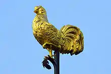 The "Brickegickel" ("bridge rooster") is inseparably linked to the history of the Alte Brücke. In 1401, a crucifix was constructed deployed on the middle arch of the bridge, the cross arch, to mark the position of the deepest point in the waterway. At top of the crucifix, there was a golden rooster, as a symbol for vigilance, and also as a symbol for the remorse about the betrayal of Saint Peter to his Lord Jesus. The rooster was supposed to remind mariners to be cautious when steering their riverboat through the strong current below the narrow bridge arch. Also, at this place, for many centuries, executions had been performed. When the last glimpse of the condemned person faced the Brickegickel, the rooster reminded them of Receptance, while the crucifix promised divine grace and forgiveness of their sins.