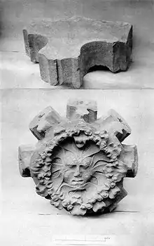On 23 August 1843, the thousandth commemoration day of the Verdun Treaty, the Städel Museum (city museum) donated a statue of Charlemagne to the city. The sculpture, made of red sandstone by sculptor Johann Nepomuk Zwerger, was deployed at the eastern middle pillar of the bridge, facing the city. In the progress of deconstructing the Alte Brücke in 1914, this statue was moved to the yard of the Historical Museum of Frankfurt. During the bombing of Frankfurt in World War II, the statue has been severely damaged; the head and the hands of the statue have been destroyed. In 1986, it was repositioned in front of the entrance of the historical museum in Römerberg, after sculptor Edwin Hüller had restored head and hands of the statue. In 2011, the museum in Römerberg was deconstructed to be re-built, and the sculpture was moved to a depot. During discussions in Frankfurt to extend and renovate the Alte Brücke, the citizens expressed the wish to re-situate the Charlemagne statue in its original place on the bridge. Because the financial situation of the city did not allow such a project at that time, a society named Brückenbauverein Frankfurt e.V. ("bridge building club of Frankfurt, registered society") was founded in 2006, under the lead of architect Christoph Mäckler.[20] In the end of 2014, the city community council decided to leave the original in the new museum building in Römerberg, and to put up a copy on the Alte Brücke, exactly where the "Brickegickel" had been located from 1967 to 2013. On 1 October 2016, mayor Feldmann inaugurated the memorial.[21]