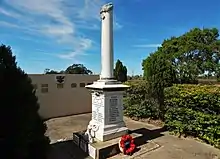 The Alton Downs War Memorial was officially unveiled on 16 October 1920 by Mrs H.G. Wheeler to honour those from the district who served in World War I. The memorial is made of Ulam marble and is a 12-foot (3.7 m) broken column (signifying young life cut short). It cost £180 to erect and the stonemason was Frederick Moulton Allan of Rockhampton.[14][15][16]