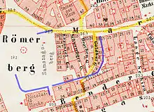 Archaeological digs on the Römerberg, and most recently near the Alte Nikolaikirche, revealed slight remains of a wall to be considered Carolingian, which would presumably have surrounded the settlement on the Samstagsberg and, in a continued process, would also satisfactorily explain the striking rounding of the plots on the former Goldhutgasse. If one follows this assumption, to the south the wall roughly followed the course of the later Bendergasse; however the northern and western extent can only be guessed at. Overall it is a typical, ring-like fortification, the former row of buildings in the eastern part until the destruction of the Second World War was reflected by the parcels within their former borders.