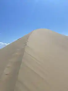 The "Singing Dunes" are located 300 kilometers (190 mi) from Almaty National Park. The area is referred to as the Singing Dunes on account of the rumbling sound emitted from the sand. The Singing Barchan dune is 1.5 km (0.93 mi) long and 120 m (390 ft) high. The barchan is crescent-shaped. When the wind is blowing from the west dispersing the sands, it can sound as if a pipe organ is playing. The cause of this phenomenon is still a mystery, but scientists theorize that in hot dry weather the sand gets electrified due to friction and creates a certain sonic vibration.[8]