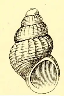(Orignal description) The small shell is white, long-ovate, with a regularly tapering, blunt-tipped spire. It shows a strongly impressed suture and four to five evenly convex whorls. These are rather finely and regularly reticulated by transverse ribs and revolving cinguli of nearly equal strength, except on the base, which has only the spiral sculpture. The apical whorls are relatively large, obtusely rounded and nearly smooth. On the second whorl a few revolving lines appear. The lower whorls are crossed by about fourteen to sixteen, regular, rather elevated, but not broad, rounded ribs, which are nearly straight and separated by pretty regular interspaces, usually about twice as broad as the ribs. On all except the body whorl, the ribs extend from suture to suture. On the body whorl they fade out a little below the periphery. The whole shell, except the nucleus, is covered with well developed, rather thin, revolving cinguli, which are about the same height as the ribs, though rather thinner, but in crossing the ribs they do not form nodules, so that the surface is cancellated with a regular network, of which the meshes are squarish, or elongated in the direction of the revolving lines, but below the periphery of the body whorl the cinguli become stronger and the ribs fainter, while the greater part of the base is occupied with cinguli only, which are here rather closely crowded. On the penultimate whorl there are about six or seven cinguli. On the body whorl there are sixteen to nineteen, of which eight or nine are posterior to the lip, and six or seven anterior to it. The surface is also marked with very fine revolving striae, visible under the microscope. There is no umbilicus. The aperture is rounded or very broadly ovate, usually slightly narrowed and obtusely angled posteriorly, broadly rounded and slightly flaring in front. The outer lip is sometimes thin and sharp, sometimes distinctly thickened, but without a varix. Anteriorly it is slightly effuse, and sometimes forms there a faint rounded angle. The inner lip is continuous, forming a regular curve, but not quite so convex as the outer margin. The portion in contact with the body whorl has a free edge, and in the umbilical region the margin is a little reflexed, often leaving a slight furrow beneath it. [3]