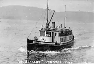 Alverene was first operated under the command of Capt. John H. Prather (b. 1868), a prominent businessman of the Whidbey Island cooperative community of Freeland, Washington.[5] Shortly after Alverene was completed, the vessel was seriously damaged in a docking accident that occurred on August 16, 1912, at Everett. The accident caused by the much larger steel-hulled steamship Sioux.[1] In 1914 Alverene was providing regular service to the community of Greenbank, Washington.[4]