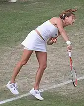 Mauresmo was an aggressive player with an all-court game, who was noted for her technical mastery. Her strongest groundstroke was her one-handed backhand, which was one of the most effective on the WTA tour. Mauresmo could hit her backhand flat and with depth, with topspin, or with slice; her backhand was responsible for most of the winners she accumulated on court.[23] Her forehand was more erratic, and players acquainted with Mauresmo's game would hit relentlessly to her forehand to try to force an error. Throughout her career, however, Mauresmo made improvements to her forehand, and, by 2005, it became a stroke she utilised more frequently and with more success. Her serve was powerful, with her first serve averaging 107 mph (172 km/h), and being recorded as high as 116 mph (187 km/h), enabling her to serve aces regularly. A reliable second serves, typically delivered at 92 mph (148 km/h), meant that double faults were uncommon. Mauresmo was one of the strongest net players on the WTA Tour, and would frequently choose to finish points at the net. An exceptional volleyer, she had deft touch at the net and had a complete repertoire of shots to perform there. Although not a net-rusher like Martina Navratilova or Billie Jean King, Mauresmo was a proficient serve and volleyer; this tactic was especially effective on grass courts.[24] She was an aggressive returner, standing on the baseline to receive first serves, neutralising them effectively with a backhand down-the-line or an inside-out forehand. She would stand several feet within the baseline to receive second serves and could hit return winners frequently. Despite her exceptional skill, Mauresmo's greatest weakness was her lack of confidence, nerves, and inconsistency; these were discussed at length by the media throughout her career.[25] Mauresmo's game was effective on all surfaces, and she won tournaments on all four surfaces.