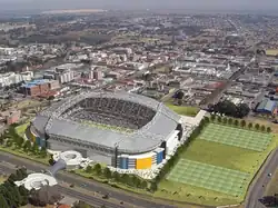 From the start, the stadium had been planned at a cost of R680 million, with a capacity of 55,000 seats.[3] In fall 2006 the project became upgraded to cost R1.2 billion (£105 million), due to demands from Kaizer Chiefs, for the stadium to comply with FIFA standards. The stakeholders behind the project, were also reported in March 2007 to negotiate with the Joburg World Cup organisers, about the award of a possible status as "official training venue for the 2010 FIFA World Cup", and in that regards also needed to update the project to comply with all FIFA standards.[4] Due to the increased cost for the project, Lefika Emerging Equity however in the following years failed to fund the project, with the promised completion date first being announced to be December 2008, and then in 2008 getting postponed to an expected completion date in June 2010. The revised construction plan, also outlined two phases, with the stadium construction to be completed first. The rest of the sports complex, which was planned to include a: cricket field, rugby stadium, sports hotel, and a retail shopping centre — specializing in sports equipment, would only be developed at a later stage, several years after construction of the stadium. It was confirmed, that the Gauteng Provincial Government in no way was a financial partner of the project, but had signed a pledge to improve the road and rail access to-and-from the planned stadium -including the construction of a nearby parking lot for 3000 cars.[5]